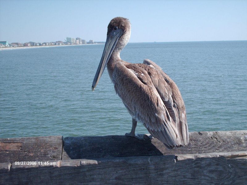 Pelican sitting on handrail of Cherry Grove Fishing Pier in North Myrtle Beach in South Carolina.